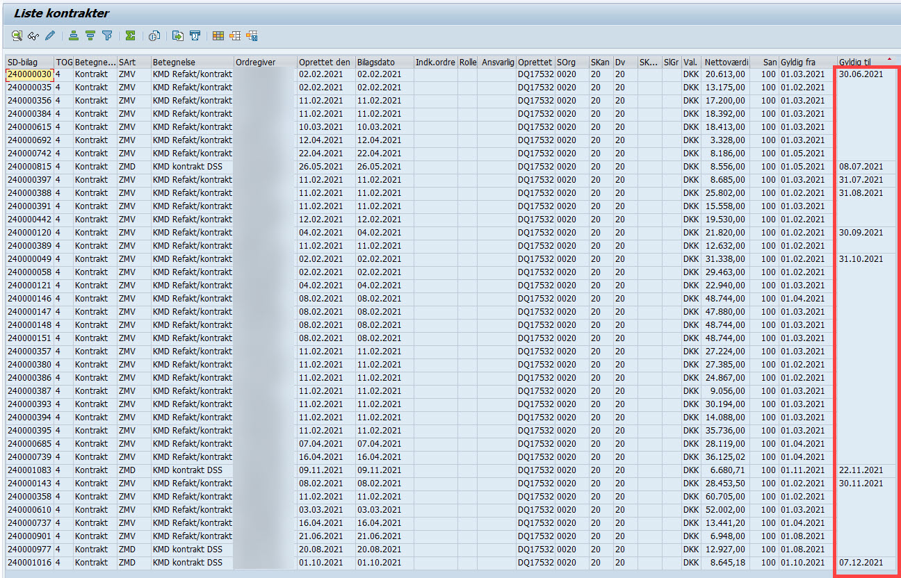 Udtrækket, man får, er kontrakter med en slutdato, der ikke er 31.12.9999. Ofte kommer kontrakter frem, hvor Gyldig til-dato (slutdato) er nået - se gerne vedhæftet skærmprints som eksempel.