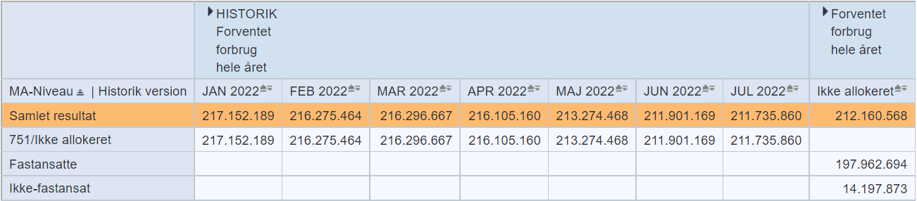 Som vist i bilaget forsvinder værdien for medarbejderniveau i "historik - forventet forbrug", hvilket gør, at man ikke kan bruge medarbejderniveauet i rapporten. Det vanskeliggør sammenligninger over tid, da det kunne være hensigtsmæssigt at se udviklingen for hhv. fastansatte og ikke-fastansat personale.