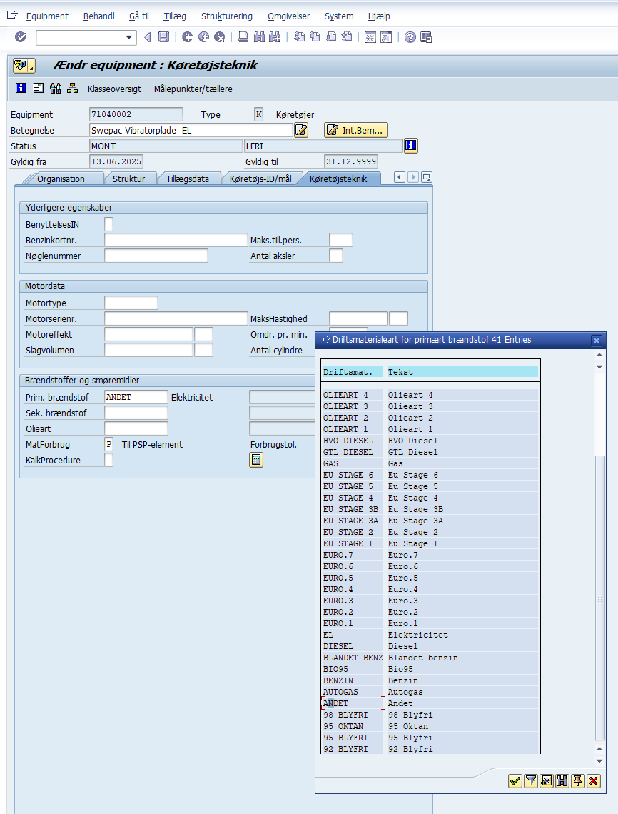 Hej - inde i KMD SAP, transaktionskode IE02, ændring af equipment, ønskes mulighed for at kunne tilvælge en driftsmaterialeart lydende på "ingenting", "Intet" eller lignende for køretøjer som ikke kører på brændstof eksempelvis trailere. Se vedhæftede fil.