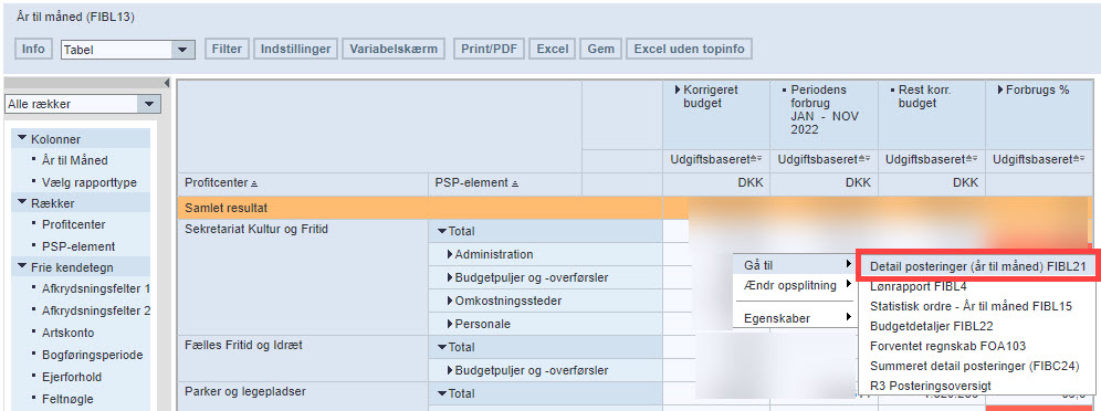 Det er i forbindelse med en 'År til måned (FIBL13)' rapport, hvor man skal springe videre til en anden rapport, f.eks. gå til 'Detail posteringer (år til måned) FIBL21' - se vedhæftet skærmprint.
